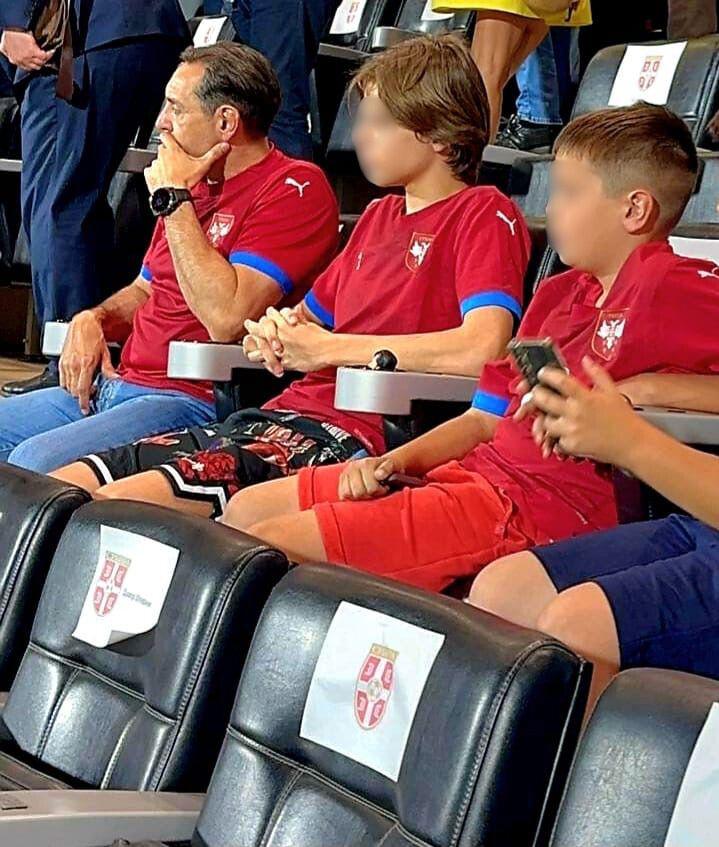 Aleksandar Vulin u društvu sinova Sergeja i Olega prati fudbalski meč između reprezentacija Srbije i Andore na stadionu "Dubočica" u Leskovcu.